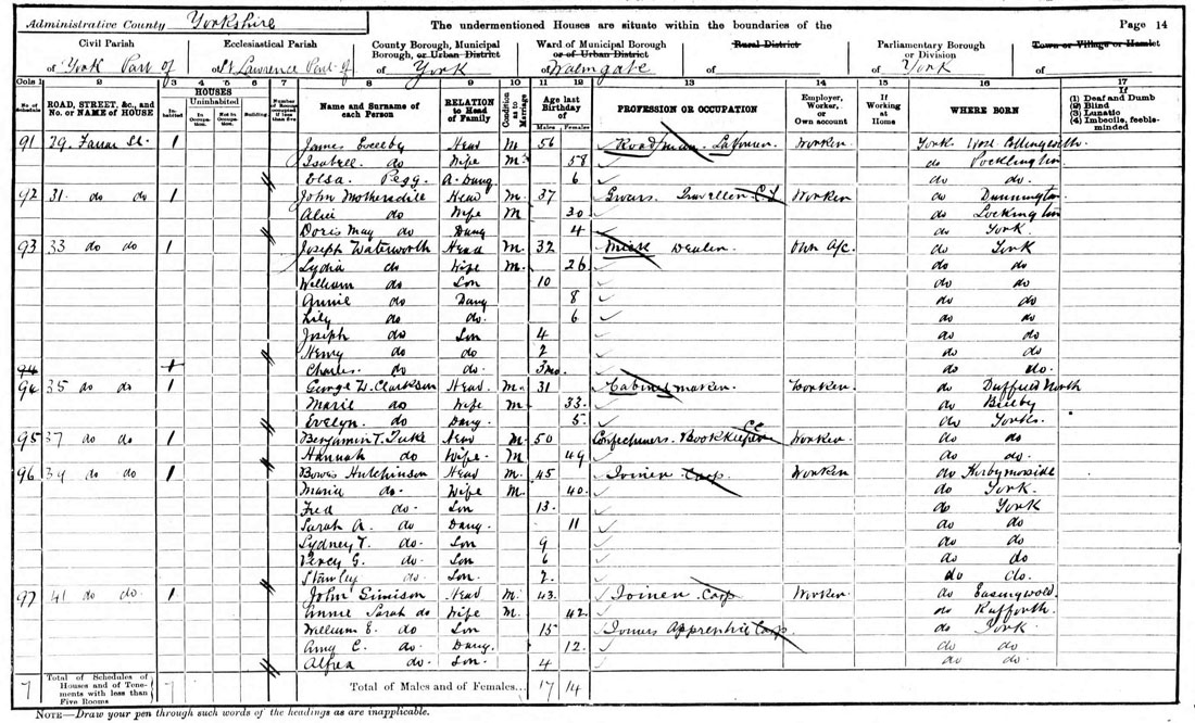 Charles Waterworth's birth was registered in York in the 1st quarter of 1901 and he appears on the census of 31st March aged 3 months, making it very likely he was actually born in January of that year. On the afternoon of 2nd August 1912 Charles was apparently playing at the edge of the swollen River Ouse at King's Staith, with his Hoop & Stick. The York Press of the same day reports that he lost is balance trying to recover the 'stick' and fell into the flooded river. A young man called Percy Storey (aged 16) of 2 Cumberland Street attempted a rescue using a boat from a nearby stand, but was too late and Charles drowned. At the time of Charles' death he was living with his parents and 5 Brothers and Sisters at 33 Farrar Street, York. Charles' Father Joseph was at this time employed at the Corporation Smith's Shop, Foss Islands. Charles is buried in York Cemetery in the plot originally purchased for his Aunt (Annie Nicholson) in 1886 by her Father Joseph Waterworth. Also buried in the plot are Joseph himself and his wife Mary who died in 1917. |