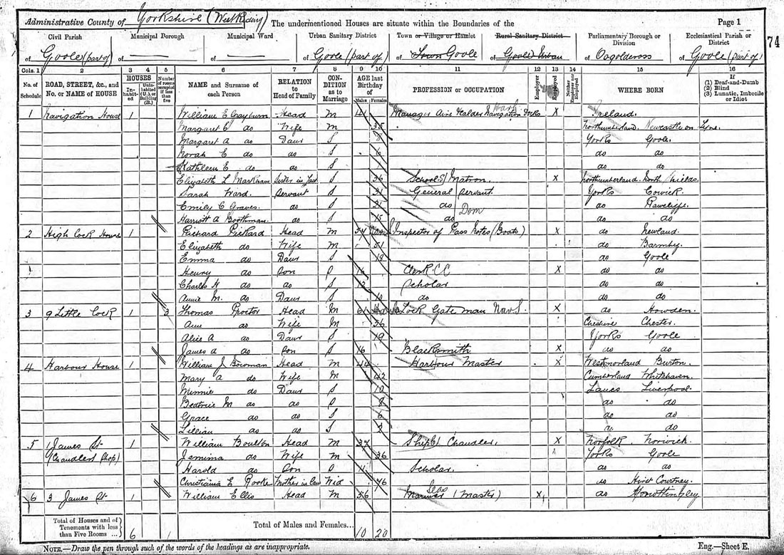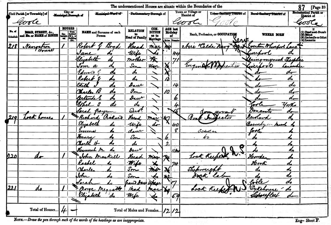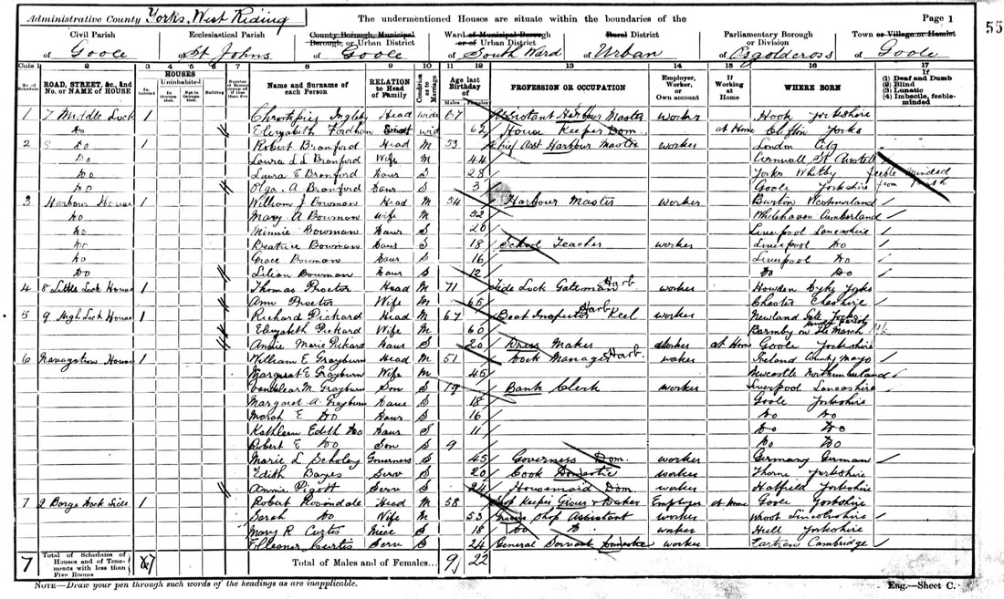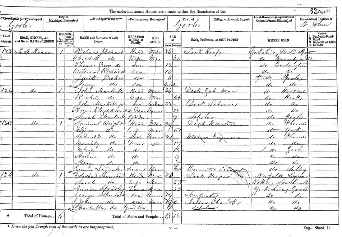 Richard married Sarah Ann Hunt in Seaton Ross on 16th April 1856, where it would appear he briefly resided as his eldest daughter Sarah Elizabeth was born there in the same year. His first Son Thomas George was born in Eastrington, where Richard and his Wife are recorded in the 1861 census. Richard's Father George is also living close by with his Wife Elizabeth and youngest daughter Rebecca (born 1848). Richard and his wife Sarah Ann had three sons before her death in 1867 - Thomas and William (both born in Eastrington) and the curiously named Jewitt. Richard clearly moved again before the death of his first wife as Son Jewitt was born in Goole in 1865. The 1871 census records Richard with a new wife Elizabeth and 9-week old son Henry. Richard is now employed as Lock Keeper and living at Lock Houses. The Goole Docks records there were only 3 locks in existence in 1871 so we can assume Richard was in charge of one of these. A fourth lock (Victoria lock) was opened in 1888 to cope with larger vessels entering the port. Richard Pickard is still living at Lock Houses on 3rd April 1881 with two further children, Charles and Hannah, but has now progressed to the position of Boat Inspector. Ten years later, aged 57, Richard has moved to High Lock House and is now employed as 'Inspector of Pass Ports (boats)' [literal transcription from the census]. Son Henry Pickard is employed as a Clerk but still living at home in 1891. Richard's youngest daughter Annie Marie is now also shown on the census and continued to reside with her parents until at least 1901 when she appeared as a dressmaker living at home. The census of 31st March 1901 (the latest available) shows Richard Pickard is still working at Goole Docks at the aged of 67, where he is now a 'Boat Inspector'. Richard's death at age 80 was registered in Goole in the 3rd quarter of 1914. |